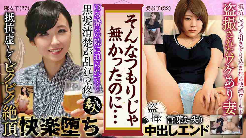 【1人目奧さん】ショートヘアーの可愛らしい奧さん。お小遣い稼ぎに下着を売りに来た様子、買取りオヤジの言われるままに下着姿を披露、もっと使用済な感じが欲しいからと電マオナニーを依頼され、○撮されている事も知らずにオナニーに没入していく奧さん。何ともリアルなオナニー&見事な絶頂を見せてくれます。オヤジチェックでシミが足りないと更なる電マ責め、オナニーで火の着いた身体に追い打ちをかける、この刺激はたまらないようで、抵抗もままならず快感に堕ちていき、見事な絶頂。どさくさ紛れに身体を弄られ、文句を言いつつも快感に負けていく姿がたまりません。チンポを出してフェラをねだるオヤジに「頭おかしい」とか言いつつも、なにやら耳打ちされて、フェラ開始、調子に乗って挿入しようとするオヤジ、当然、拒否されるが、やはりなにやら耳打ちされて、挿入を受け入れる奧さん。感じまいとしつつも漏れ出る声を聞き、調子に乗ってゴム外して生挿入、生チンでガン突きされて、辛抱たまらずイキまくり、美しく張りのある爆乳と共に必見です。最後は中出しされて放心状態の奧さんでした。【2人目奧さん】色白黒髪、清楚系の美人妻です。温泉ロケの打ち上げでシコタマ飲まされ、程良く酔ったところで迫られて陥落、しっぽり快感に酔いしれているところにスタッフ乱入、困惑しつつも抵抗もままならず、か細い喘ぎ声を漏らし快感に没入していきます。品良く淫らに快感に浸っていく姿がたまりません。そそる痴態とはこの事ですね、徐々にヒートアップしていき、見事なイキッぷりも披露してくれます。良いです、実にチンポに響く奧さんです。